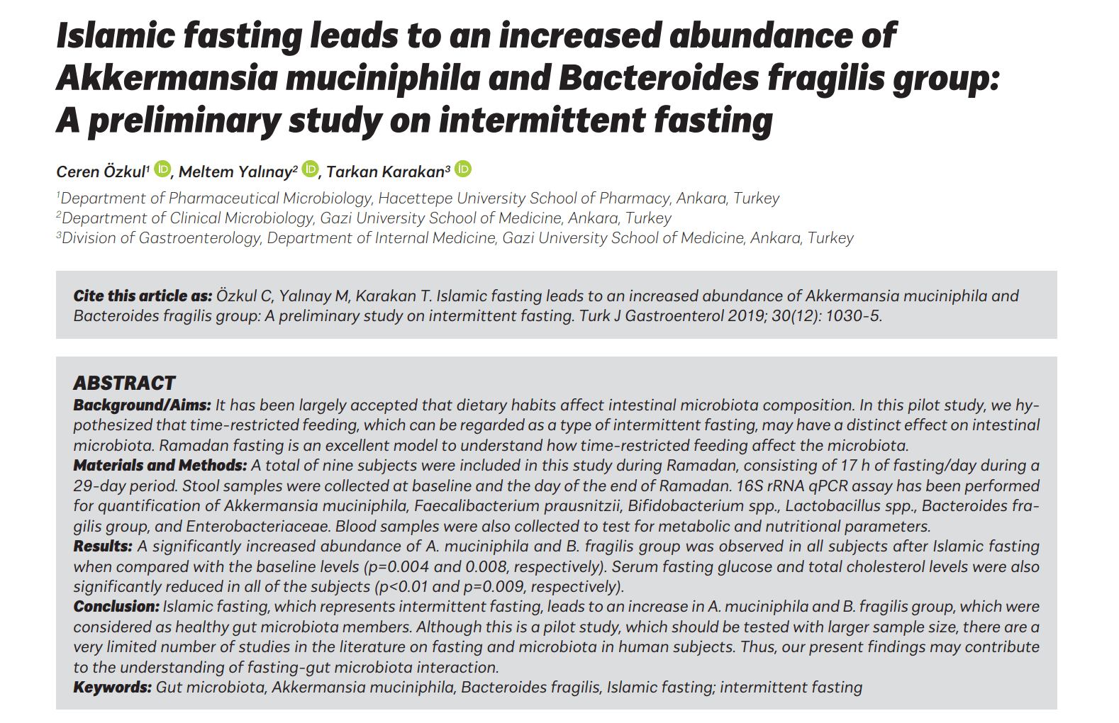 Eine Studie von 2019 zeigte “eine signifikante Zunahme von A. muciniphila und B. fragilis nach dem Ramadan Fasten, die weitgehend als Hauptbestandteile eines gesunden Darm-Mikrobioms anerkannt sind.“